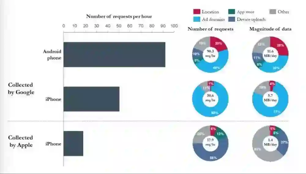 “一台休眠的Android手机,只要Chrome浏览器后台处于活动状态,会在24小时内向Google传送位置信息340次。位置信息占发送给Google的所有数据样本的35%。相比之下,没有安装Chrome浏览器的iOS设备,Google就无法收集任何数据。”