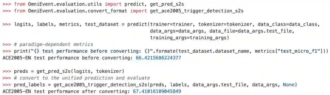 不同算法范式的评测方式存在一些微小差异,因此它们往往并不直接可比。OmniEvent将不同算法的预测结果转换对齐到统一的候选集合,进而提供一致的、公平的评测。对于MAVEN和LEVEN这种需要提交榜单进行评测的数据集,OmniEvent也提供了一键生成提交文件的功能。