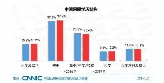 第一,在中国所有网民中,初中及以下占比为54.1%,占据一半以上,而本科以上则只占11.2%。
