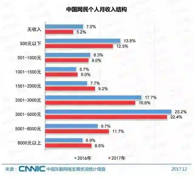 第二,在中国所有的网民中,月收入3000元以下的占比57.4%。