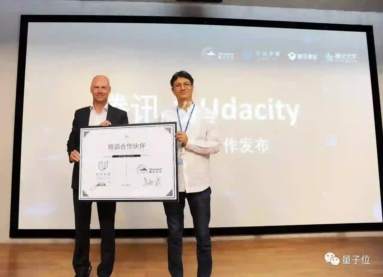 腾讯作为中国最大的互联网公司之一,当然是特龙和优达学城“觊觎”的对象。而且就在近日,腾讯和优达学城宣布正式达成深度合作,在深圳的腾讯大厦,塞巴斯蒂安·特龙围绕“人工智能”进行了一场演讲。