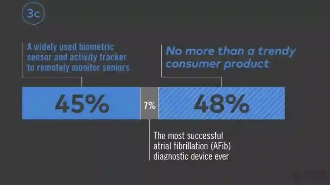 此外,超过半数的受访者相信Apple Watch能够在医疗领域发挥积极作用。数据显示,48%的受访者认为Apple Watch仅仅是一种时尚的消费产品,其余受访者均表示它是一款可穿戴的生物识别传感器和生物追踪器,能够广泛应用于老年人活动的实时监测,其中7%的受访者进一步表示Apple Watch将是“有史以来最成功的心房颤动监测装置”。