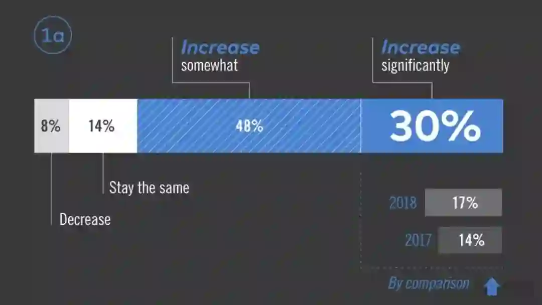 首先,对于科技公司的数量变化,大部分受访者持积极态度。其中30%的受访者相信未来两年新的医疗科技公司数量将大幅增加,48%的受访者认为科技公司将会有所增加,14%的受访者表示保持不变,只有8%的受访者认为新的医疗科技公司将会减少。