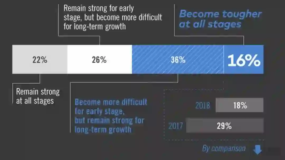 其次,对于投入医疗科技公司的资本变化,250名受访者态度不一。22%的受访者认为资本在各个阶段都将保持强势增长;16%受访者持相反意见,认为资本在未来的增长十分困难;其他受访者的态度介于前两者之间,他们认为投入的资本总额将会略有上升,但在不同阶段会不断波动。