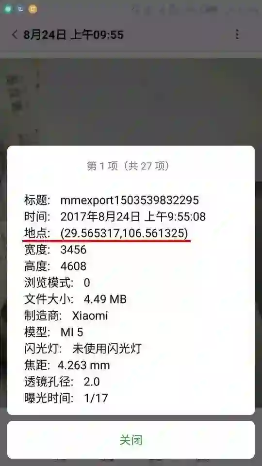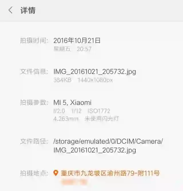 点击详情,可以看到拍摄的详细信息,包括经纬度地址,拍摄时间,手机型号等。在查询经纬度,你所在的位置就一目了然。