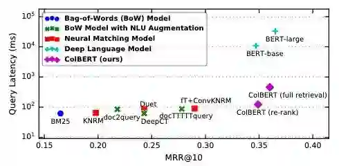 通过实验数据对比可以看出,ColBERT 的效果比传统 ConvKNRM 明显要好,此外检索的速度比 BERT-base 模型要快几个数量级。