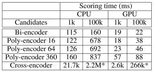 实验结果已经表明 Poly-encoder 明显优于 Bi-encoder架构,且性能逼近 Cross-encode 架构的效果。在检索耗时方面,其速度比 Cross-encoder 足足快了约 2600-3000倍!
