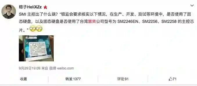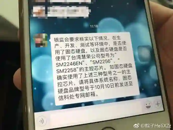 百度贴吧、新浪微博、天涯社区等多个网站发现一则爆料:“银监会要求核实以下情况,在生产、开发、测试等环境中,是否使用了固态硬盘,以及固态硬盘是否使用了台湾慧荣公司型号为 SM2246EN、SM2256、SM2258 的主控芯片。”