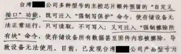那么爆料所说的后门是什么呢?所谓爆料指的是:控制器预留的自定义接口功能,“强制写保护”和“强制擦除所有块”命令。