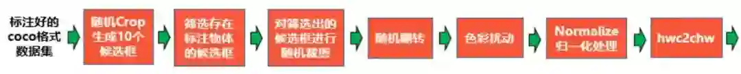 标注好的数据无法直接用于训练,因此,在拿到标注好的数据后,MindSpore 团队首先会对其进行数据清洗的工作,从中审查和纠正出「脏」数据,然后再开发一套格式转换工具,将标注数据的格式转换为训练可用的 COCO 数据集格式。通常,这样的数据仍存在一些不规则的地方,在训练前还需要对其进行一系列的数据预处理操作,再喂给模型进行训练。目前,这些数据预处理方法都是基于 MindSpore 提供的接口实现的,感兴趣的开发者可以详细阅读 MindSpore 的 API 文档。