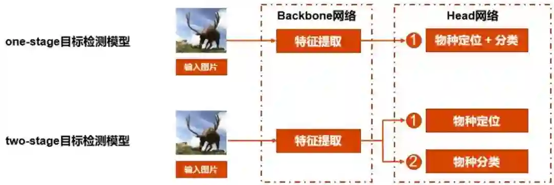 目标检测模型分为 one-stage 和 two-stage 两大类,两大类模型的共同点在于 Backbone 骨干网络都用于对输入图片进行特征提取工作,区别则在于 Head 网络,one-stage 模型在一个阶段即可完成对目标的定位与分类,而 two-stage 网络则是分两个阶段完成,先完成目标定位,再对定位的目标进行分类,即对输入的图片先通过滑窗得到几十万个的框,要求物体正好出现在一个滑窗中,这个滑窗的位置即为物体的位置。对于一张图片来说,存在大小各异的物体,这就导致设计的窗口大小也存在多种,这样耗费了大量的时间,然后再使用选择算法筛选出较符合的框,对这些窗口的目标进行分类,而 one-stage 则是基于整张图片的,它并不要求物体必须在这个框内,就不需要设计大小各异的框,只要求物体的中心落在这个框内即可,因此我们就可以先预测出 X 个框的分类,再通过置信度去筛选较可信结果。