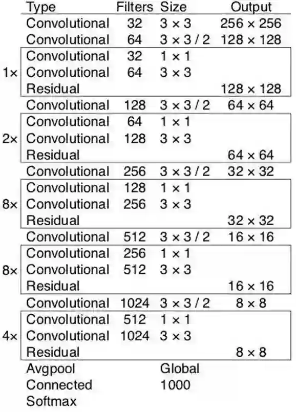 YOLOv3 使用基础网络 Darknet53,相比 YOLOv2 使用的 Darknet19,Darknet53 移除了 MAX POOLING 池化层,并增加了卷积层数,速度稍有减慢,精度大大提升,整个网络结构相对简单。