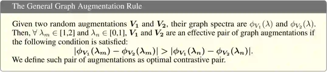 该准则表示: 两个对比图增广的图谱间高频部分的差异应该大于低频部分的差异。 我们将符合 GAME rule 的两个对比图增广称为 最优对比对 。