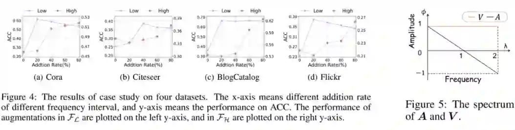 我们分别在 Cora,Citeseer,BlogCatalog,Flickr 数据集上做了实验,如图4所示。其中,横轴表示在不同频段内添加特征空间的比例,纵轴分别表示对低频/高频增广后的准确率。实验结果如下: