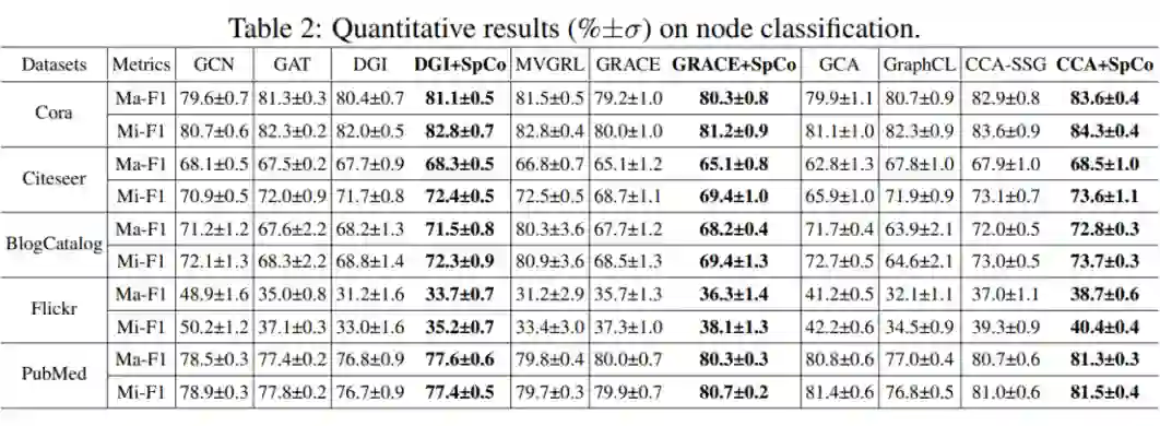 我们将基线模型中的 GCL 方法根据 loss 分为三类:BCE loss(DGI, MVGRL)、InfoNCE loss(GRACE, GCA, GraphCL)以及 CCA loss(CCA-SSG)。从这三类方法中分别选出一个(DGI, GRACE, CCA-SSG)与 SpCo 相结合,以此来验证插件 SpCo 的有效性和通用性,结果如表 2 所示。