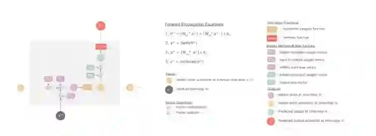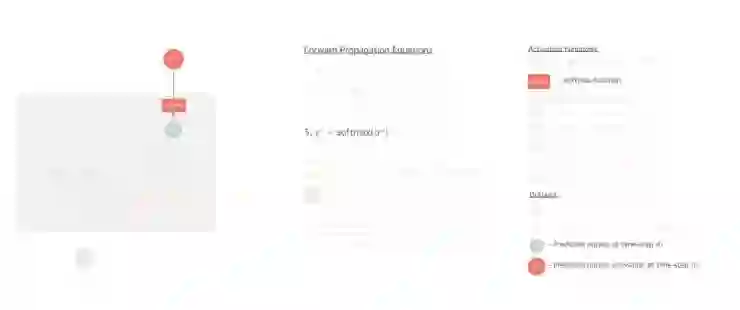 第六步:最后,通过将 o⟨t⟩ 传输给激活函数(例如 sigmoid 或 softmax),得到了一个实际输出的标准化概率向量 ŷ⟨t⟩。输出的激活函数的选择通常取决于期望的输出类型(sigmoid 用于二元输出,softmax 用于多类别输出)。
