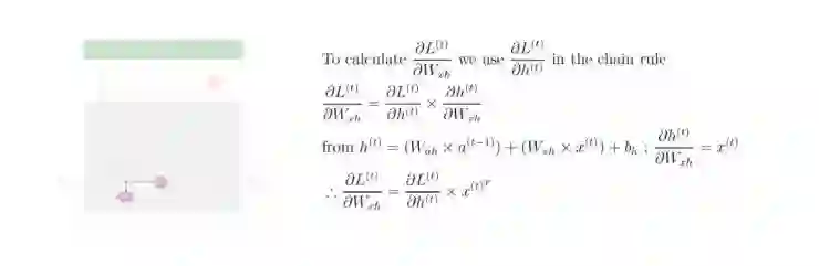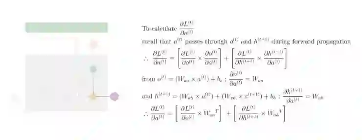 主要的区别在于我们必须将每个时间步 t 的偏导数值累加起来,从而更新权值和偏置,这是因为这些参数在前向传播的过程中是被各个时间步所共享的。
