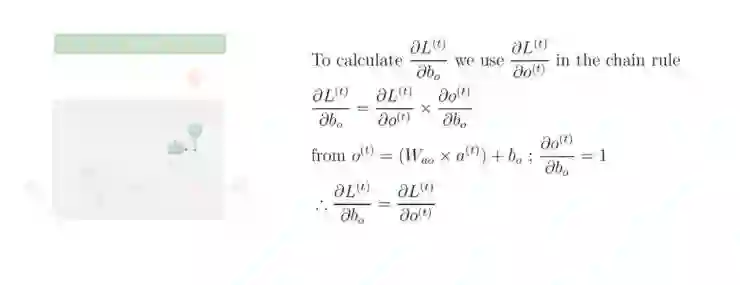 及链式法则,计算出损失函数 L⟨t⟩ 对输出过程中的偏置向量 b_o 的偏导数值: