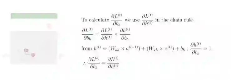 及链式法则,计算出损失函数 L⟨t⟩ 对隐状态的偏置向量 b_h 的偏导数值: