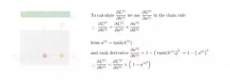 及链式法则,计算出损失函数 L⟨t⟩ 对隐状态 h⟨t⟩ 的偏导数值: