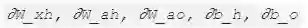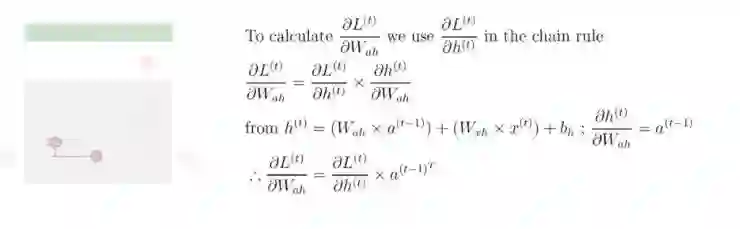 及链式法则,计算出损失函数 L⟨t⟩ 对输入层至隐层中的偏置矩阵 W_ah 的偏导数值: