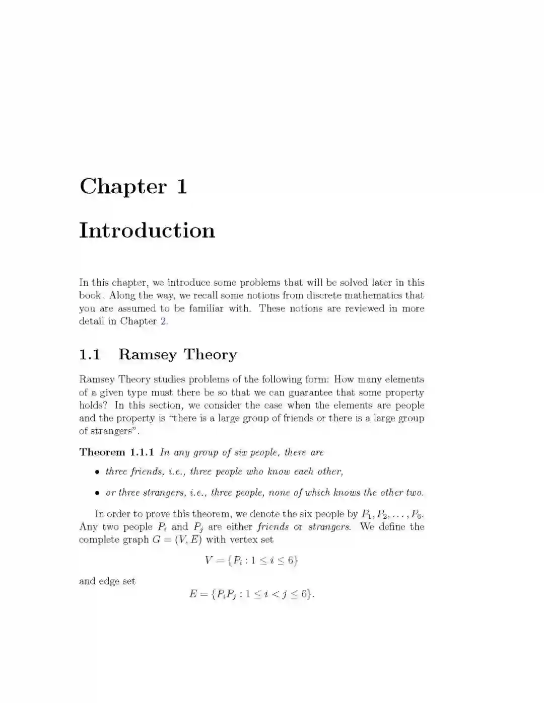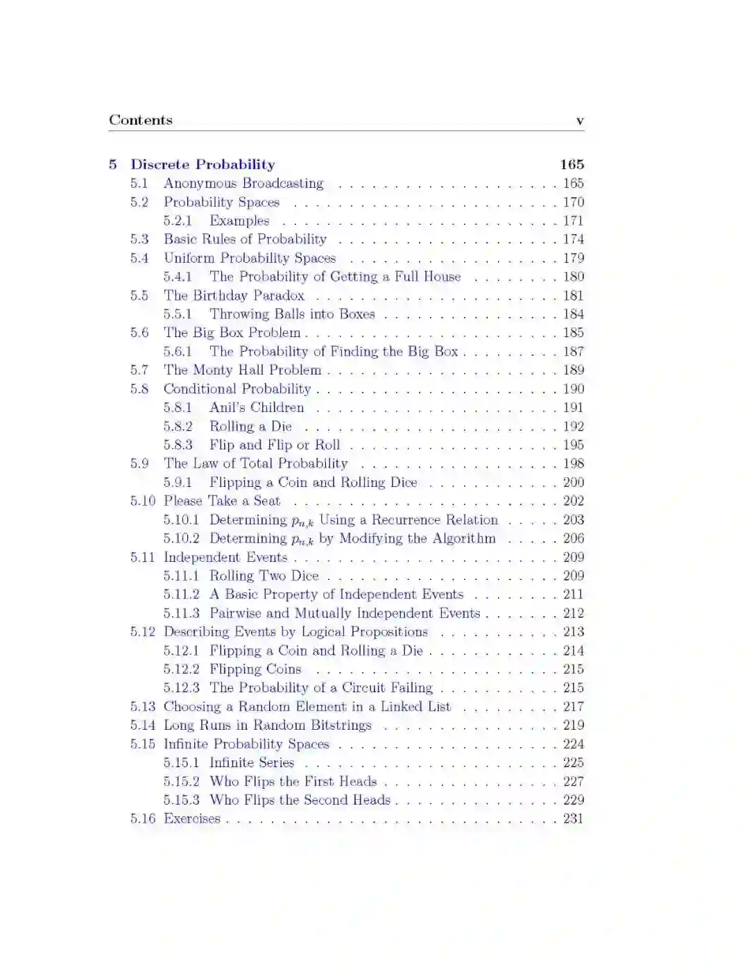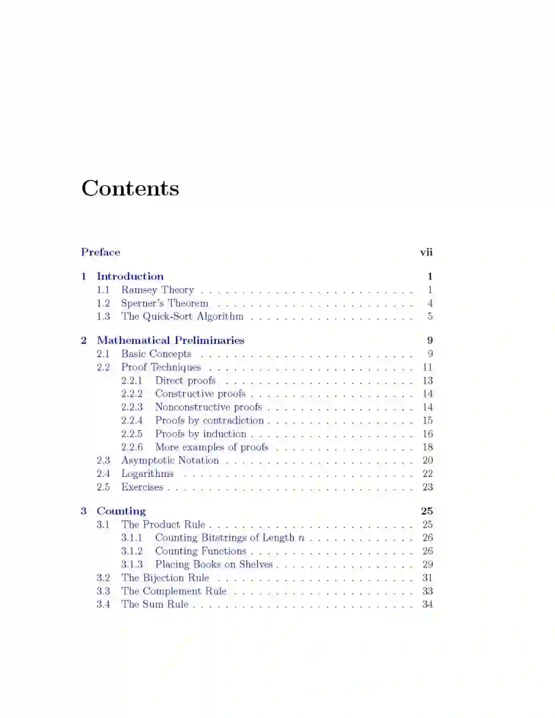 这是一本免费的面向计算机科学学生的离散结构本科课程教材,我从2013年秋季学期开始在卡尔顿大学教授。本课程为二年级课程COMP 2804(离散结构II)。学生必须修过COMP 1805(离散结构I),涵盖了数学推理、基本证明技巧、集合、函数、关系、基本图论、渐近符号和可数性。在一个12周的学期中,每周有3个小时的课,我涵盖了这本书的大部分材料,除了第二章,它已经包含在里面了,以便学生可以复习COMP 1805的材料。
