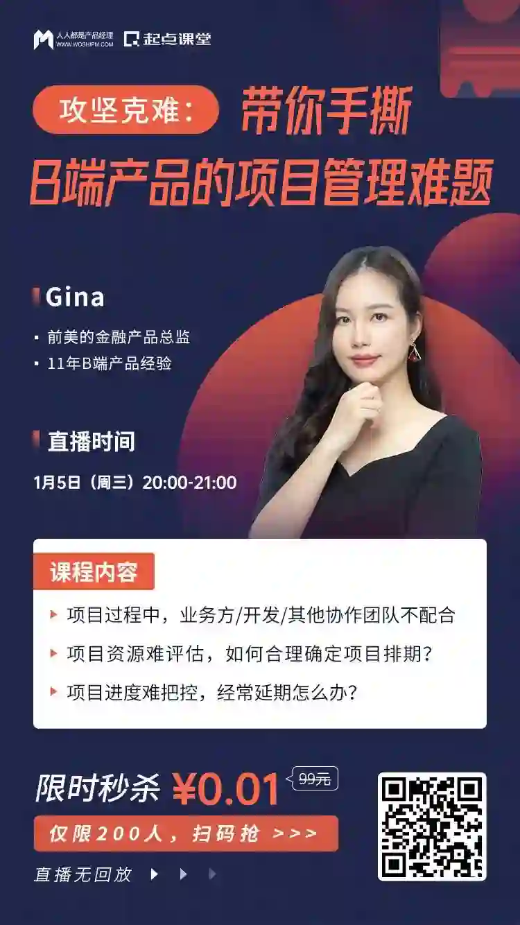 这是由起点课堂出品的B端产品公开课,专为正在做B端产品同学,或者对B端产品感兴趣想要了解相关工作内容的同学打造,课程将由前美的金融产品总监@Gina直播授课。