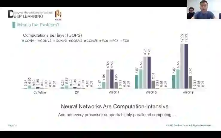 图中是一些较为老旧的神经网络所需的计算量。最新的 ResNet50 做一次前向的推理就需要 7GOPS,VGG16 大约需要 30GOPS。相比之下,手机的 ARM 处理器的计算能力典型值是 10GOPS。所以这样的网络是没办法在手机端运行的,即便只是推理任务。而当前的许多处理器也都没办法支持如此大规模的并行计算。