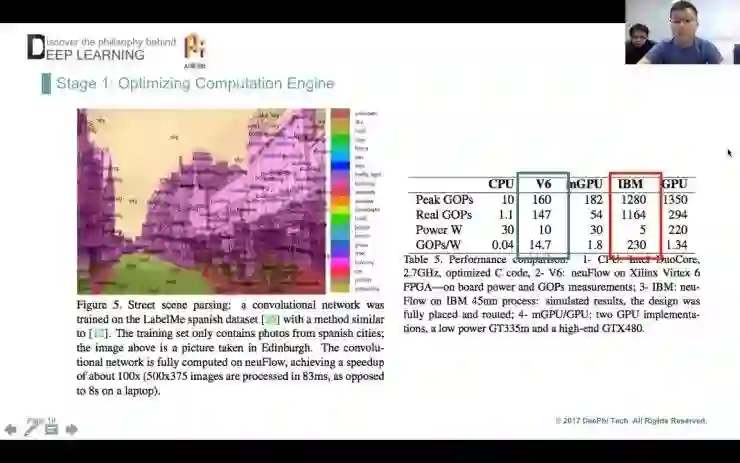 在场景解析的测试中,他们使用了 V6 FPGA 芯片,得到了非常高的峰值性能(Peak GOPs)同时,也得到了很高的实测性能(Real GOPs)。同期 GPU 的实测性能要远低于峰值性能。