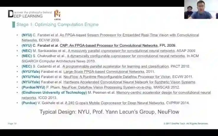 这个阶段的一个典型方案是 Yann LeCun 小组提出的 NeuFlow,设计思路是数据流的处理。他们设计了阵列式、可重构的数据流引擎,阵列中的不同单元同时进行不同的计算,显著提高了计算资源的利用率。