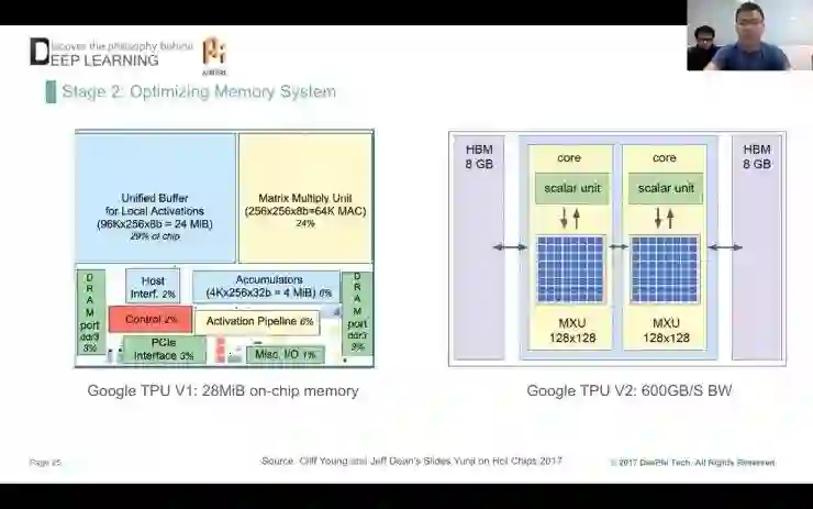 不过这种思路总体还是不错的,在企业级应用中很受欢迎,比如谷歌的 TPU 就有 28MB 的片上存储,可以装下整个 Inception 网络。在只做推理的 TPUV1 之后,TPUV2 为了兼顾训练又增加了许多片外的高带宽存储(HBM)内存,与此对应的成本和功耗也会有一定上升。