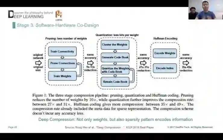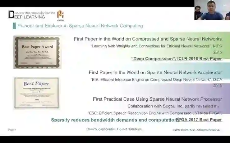 几位创始人在创立深鉴科技前做了许多研究工作,比如韩松的 NIPS2015 文章 “Learning both Weights and Connections for Efficient Neural Networks”。而后,这篇文章的改进工作 “Deep Compression” 拿到了 ICLR2016 的最佳论文。