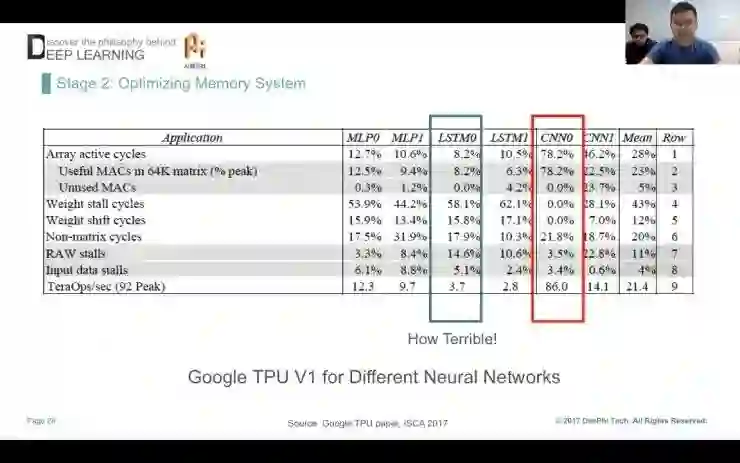 根据 TPU 论文中给出的测试结果,第一代 TPU 芯片具有 92TOPs 的峰值性能,CNN0 可以达到 68TOPs 的实测性能,这就是把整个模型的数据都装入片上缓存之后达到的效果。但运行一个无法都装在片上的 LSTM 时,实测性能就只有 3.7TOPs,大约 4% 的利用率。在他们的论文中也写道 “未来的设计中将会提高稀疏性(sparsity)考量的优先级”,即,意识到了稀疏化的重要性。