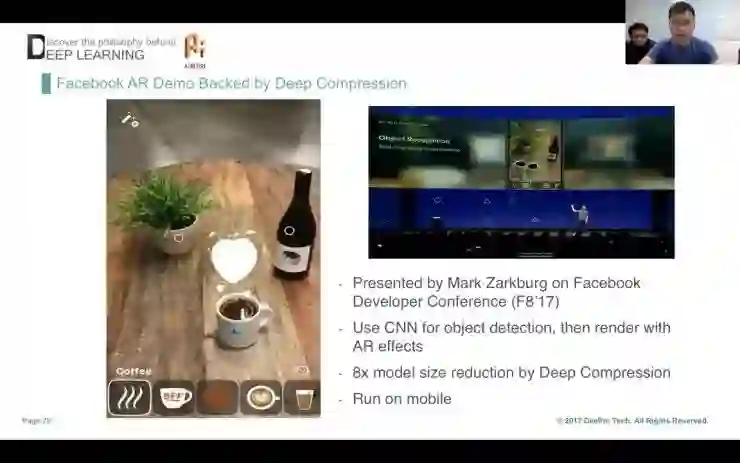 Deep Compression 最大的应用是在手机 app 中,比如 AR app 中都用 Deep Compression 把网络压小到手机能够存储、运行的大小,Facebook 的 AR Demo App 就取得了 8 倍的压缩效果。
