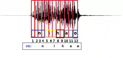 如图2所示,拿前面的nihao的发音为例,进过CTC预测的序列结果在时间上可能会稍微延迟于真实发音对应的时间点,其他时间点都会被标记会blank。
