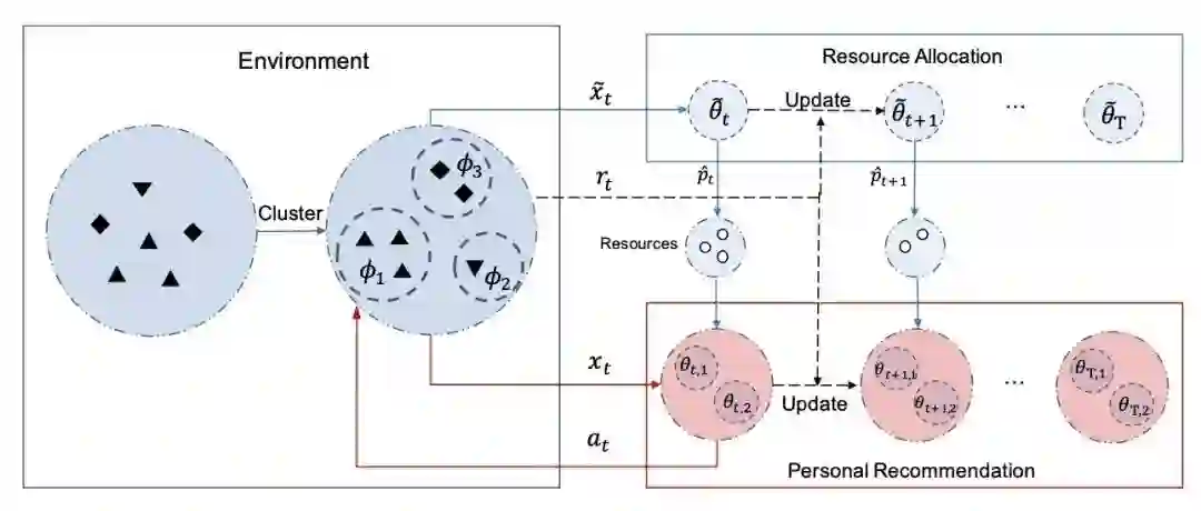 目前有很多贪心策略用于资源限制下的上下文多臂老虎机问题,即在训练的时候完全不考虑资源的分配,而采用"有即分配"的方法。该方法会产生比较大的问题,假设系统每天之内有一个资源预算总量,并且该资源总量比一天总共的推荐次数少得多,那么这种方法就会在算法执行的早期花掉所有的资源,从而忽视后来的高质量用户的请求。贪心策略可以被看作"短视"的策略,因为其分配策略不会考虑剩余的资源以及用户信息这种较为高级的信息。但是同时考虑资源分配和用户推荐实际上是一个比较复杂的问题,因为这两种策略在执行过程中会相互影响,从而很难直接得到比较好的策略结果。