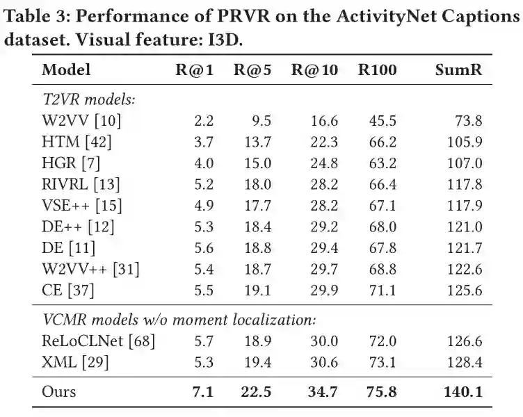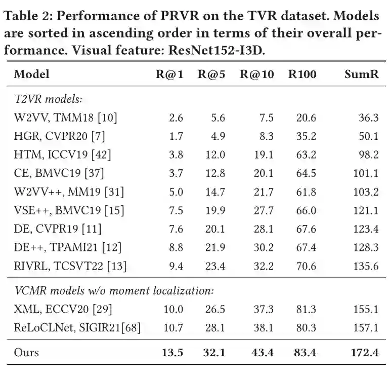 由于在上文提到,T2VR 任务的传统数据集并不适用与 PRVR 任务,所以作者使用了被用于单视频定位任务(Single Video Moment Retrieval, SVMR)和视频库定位任务(Video Corpus Moment Retrieval, VCMR)的数据集,分别是 TV show Retrieval、Activitynet Captions 以及 Charades-STA。在以上三个数据集中,文本仅与视频中的某一片段相关,且视频的相对持续时间更长,符合 PRVR 任务的检索要求。此外,作者采用 R@1、R@5、R@10、R@100 以及 Recall Sum 等性能指标来衡量模型。同时,由于当前并没有模型是面向 PRVR 任务的,作者选取了在传统 T2VR 任务上表现较好的模型作为 baseline 并在以上三个数据集上进行重新训练,以此进行性能对比。
