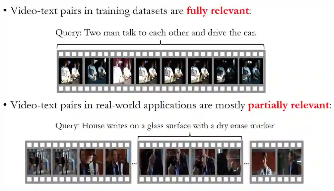 当前的文本到视频检索(T2VR)方法通常是在面向视频描述生成任务的数据集(如 MSVD、MSR-VTT 和 VATEX)上训练和测试的。这些数据集存在共同的特性,即其包含的视频通常是以较短的持续时间进行预剪辑得到,同时提供的对应文本能充分描述视频内容的要点。因此,在此类数据集中所给出的文本-视频对呈完全相关的关系。然而在现实的视频检索场景中,由于查询文本是未知的,预先剪辑好的视频可能不包含足够的内容来完全满足查询文本。