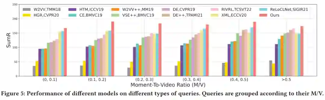 由于在上述的性能对比实验中仅反映了模型检索数据集中所有文本-视频对的整体性能,为了在更加细粒度的方面探索各模型对不同相关性的文本-视频对的检索性能,作者定义了片段时长/视频时长比(M/V)这一概念,它以通过查询文本所对应的正确片段持续时间除以整个视频的持续时间来衡量。M/V 越小,表示对应视频与查询文本相关的内容越少,反之则越多。此外, M/V 越小,查询文本与其对应视频的相关性越低,而 M/V 越大,相关性越高。根据 M/V 的大小,作者将 TVR 数据集上的 10895 个测试查询文本分为六组,并报告了在不同分组上的性能。