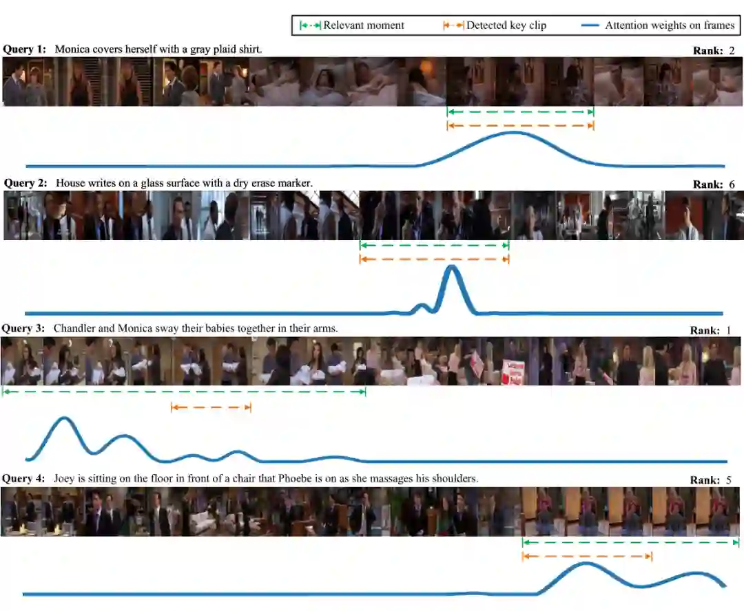 下图作者给出了一些模型检索过程中的可视化实例,分别给出了查询文本在其对应视频中由模型检测出的关键片段范围与关键片段和所有视频帧之间的相似度曲线。在前两个查询实例中,模型检测出的关键片段与正确相关片段完全重合。在后两个查询实例中,检测出的关键片段较为不准确,但是正确片段所包含的帧均具有较高的注意力权重。这表明帧尺度相似度学习分支可以帮助片段尺度相似度学习分支在一定程度上补齐缺失信息,进一步反映了模型设计双分支相似度学习模块的合理性。