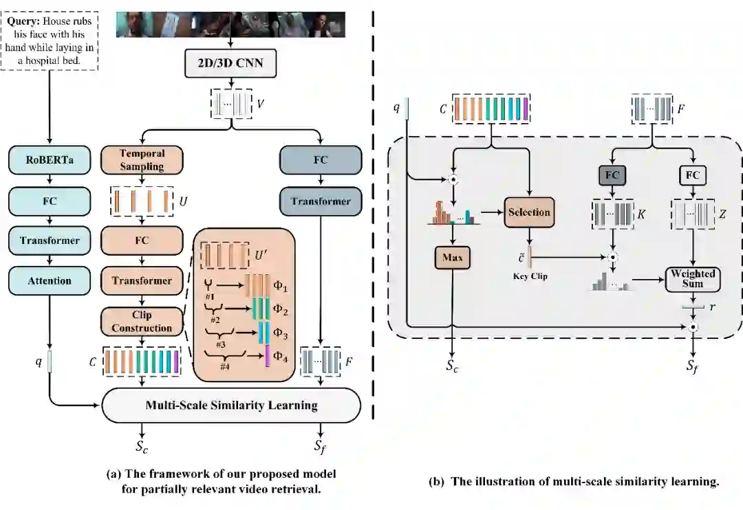 由于在 PRVR 中视频比较长,直接在计算视频文本相似性难度较大。作者认为如果模型简单地知道与查询文本相关的大致内容,它将有助于模型在更细粒度的范围内准确地找到更相关的内容。因此作者提出了多尺度相似性学习,以从粗到细的方式计算文本与视频间的相似度。它首先检测视频中最可能与查询文本相关的关键片段,然后在关键片段的指导下衡量每帧的重要性。通过联合考虑查询文本与关键片段和各帧的相似度来计算最终的文本-视频相似度。
