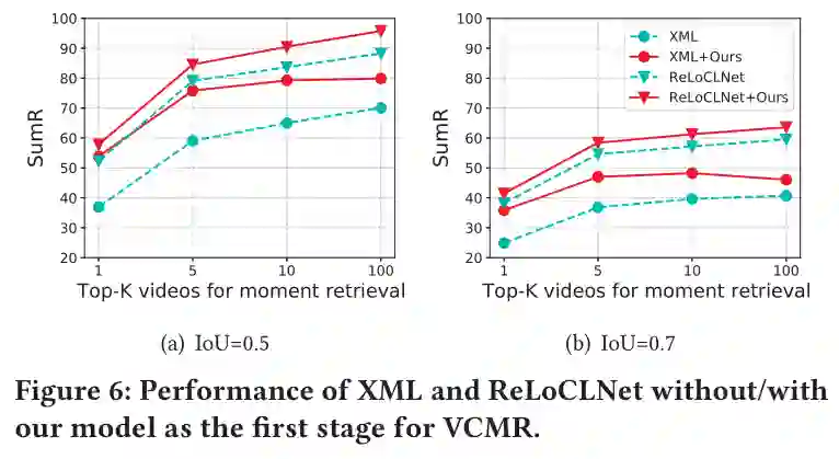 VCMR 任务旨在给定查询文本后,在视频库中检索出对应视频,并且确定查询文本在对应视频中的起止时刻。当前用于 VCMR 任务的主流模型通常拥有两个阶段的工作流程。第一阶段为从视频库中检索出 k 个候选视频,第二阶段为从候选视频中检索出准确的起止时刻。作者选取了当前性能较高的模型,XML 和ReLoCLNet,将以上两个模型在 TVR 数据集上的第一阶段检索结果替换为作者所提出模型的检索结果,从下图可以看出在进行替换后能给上述两模型带来 VCMR 任务上的性能提升。