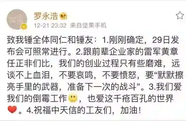 郑刚告诉腾讯《深网》,2016年锤子最艰难的时候,罗永浩自己到处去借钱,唐岩、吴咏铭等投资人也都去帮忙借了,最后大家帮锤子凑到了近亿的周转资金。“紫辉做早期投资,本身就没多少钱,但是我们基金最后1500万都全部投给锤子了。”