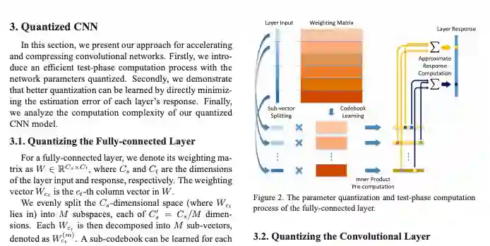 创新点:在这篇论文中,作者提出了一个Quantized CNN模型,这个模型可以加速和压缩CNN,它的核心思想是对卷积层和全连接层中的权重进行量化,并最小化每层的响应误差。