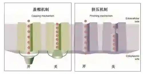 图1 水通道蛋白“盖帽”以及“挤压”门控机制模型