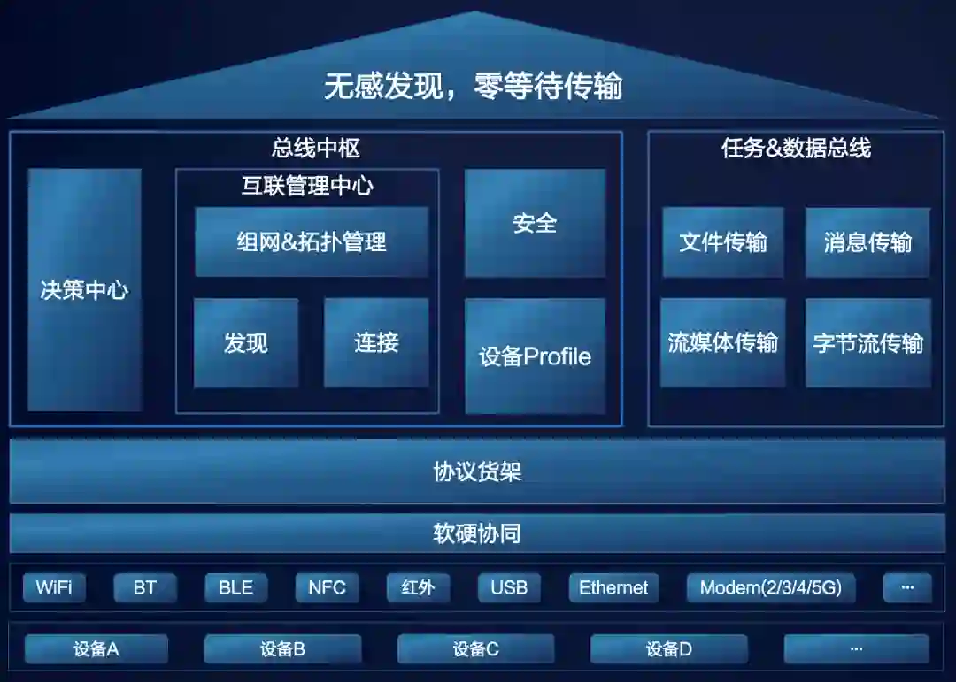 通过协议货架和软硬协同层屏蔽各种设备的协议差别,总线中枢模块负责解析命令完成设备间发现和连接,通过任务和数据两条总线实现设备间文件传输、消息传输等功能。