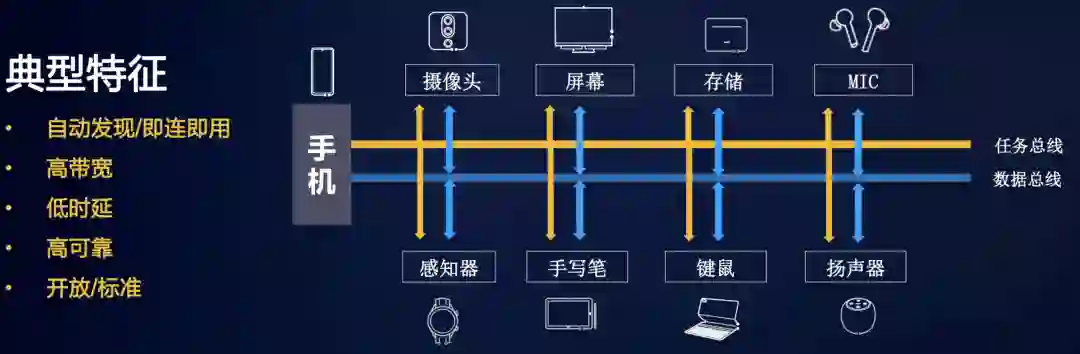分布式软总线技术是基于华为多年的通信技术积累,参考计算机硬件总线,在1+8+N设备间搭建一条“无形”的总线,具备自发现、自组网、高带宽低时延的特点。