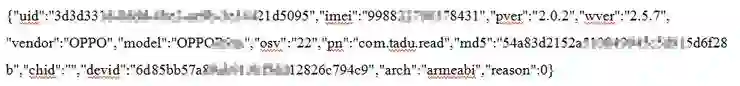 请求数据:包括uid、imei、sdk版本、手机厂商、型号、系统版本、应用包名、设备id、设备指令集等内容