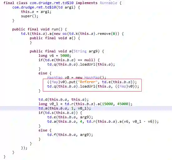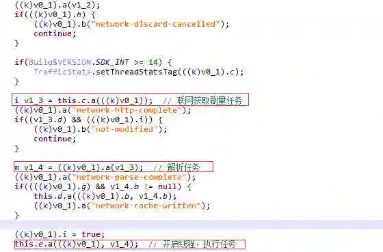 stat-impl.jar子包被加载后,线程com.drudge.rmt.g会被启动,其作用主要是用来联网获取刷量任务,并调度任务的执行。