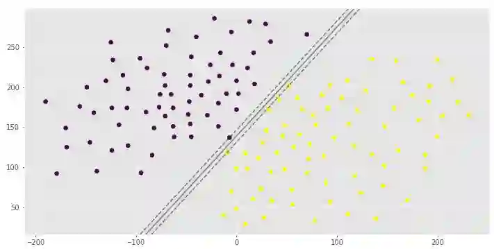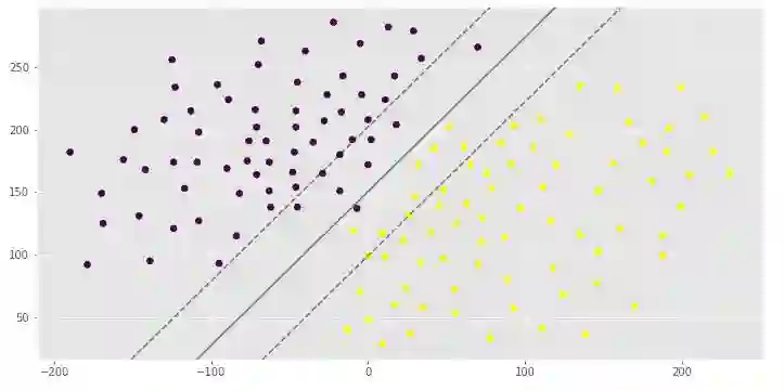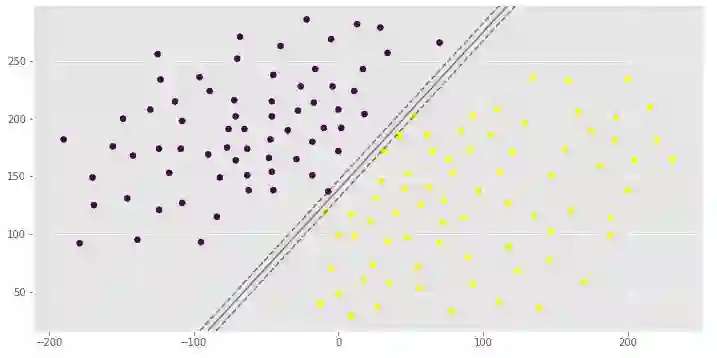 plt.rcParams['figure.figsize'] = (12, 6)style.use('ggplot')# Import Datasetdata = pd.read_csv('data.csv', header=None)X = data.values[:, :2]y = data.values[:, 2]# A function to draw hyperplane and the margin of SVM classifierdef draw_svm(X, y, C=1.0): # Plotting the Points